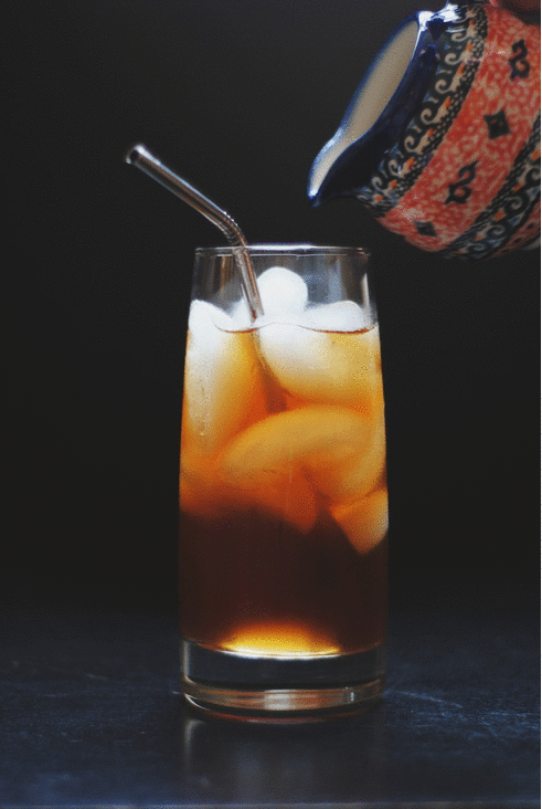 add a few tablespoons (or whatever amount that you fancy) of the mango jello cubes to glass. pour the cold tea over it and play the game where you try not to eat all the jello pieces before the tea is gone.